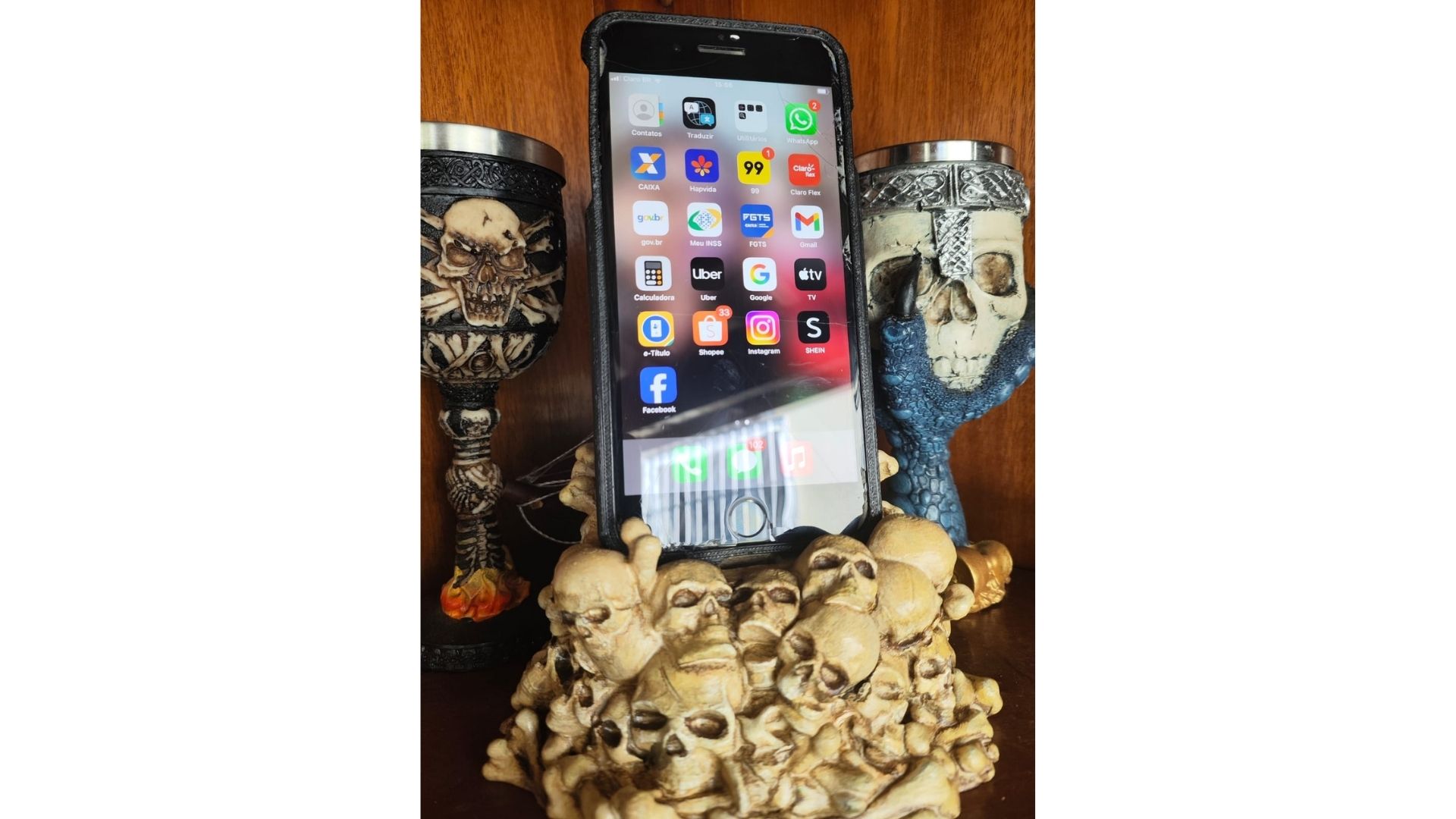 Dê um toque de estilo e atitude à sua mesa ou criado-mudo com este suporte de celular com tema de caveira!